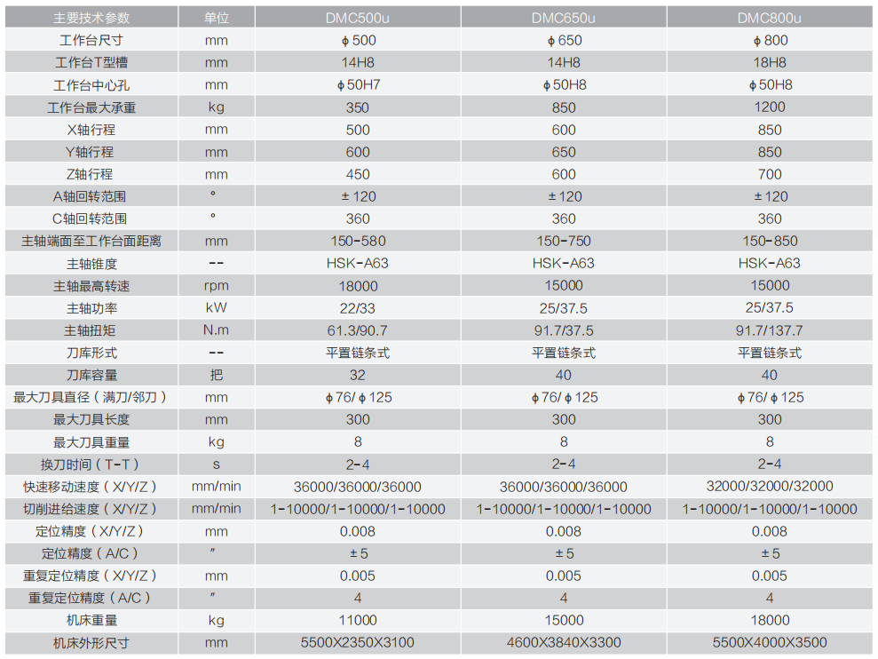 高可靠性、高效率的傳動定位系統(tǒng): 1、X、Y、Z三軸均通過進口無間隙彈性聯(lián)軸器連接高精度滾珠絲杠形式,保證機床的定位精度。 2、X、Z軸采用臺灣上銀45mm寬滾柱直線導軌,Y軸采用55mm寬四副滾柱直線導軌,提高傳動剛度。 3、回轉A、C軸配置大扭矩力矩電機,優(yōu)化了整機回轉精度。工作臺承重可達1200kg,加工范圍大。 4、回轉擺動工作臺擺動范圍大,達±120°,能加工30°底切加工。 5、配置大扭矩高轉速電主軸,變速范圍寬;恒溫水循環(huán)冷卻方式,確保主軸回轉精度的穩(wěn)定性。